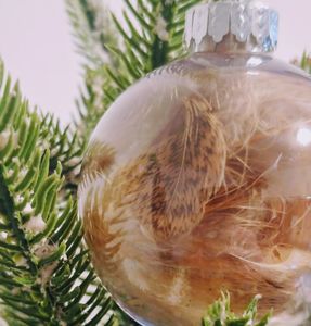 Ornement incassable rempli de magnifiques plumes aux couleurs neutres, parfaites pour un décor rustique ou champêtre.